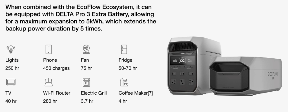•1-5kWh expandable with DELTA 3 Extra Battery, DELTA Pro 3 Extra Battery, DELTA 2 Extra Battery or DELTA 2 Max Extra Battery.